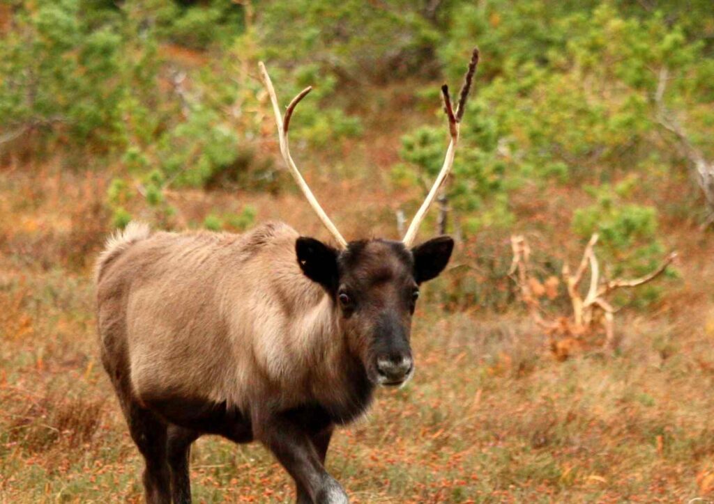 Last time we saw them properly, in late spring, they were tiny and heading out to free-range in their calf coats, which are quite different in colouration to an adult reindeer’s coat. By autumn they’ve moulted, grown their new winter coat, and are many times bigger – i.e. they look COMPLETELY different! Other than very obvious colour variation and face markings, their wee antlers are the easiest way to tell them apart. The photo below shows Macchiato at 4 months old, looking about as generic as is possible for a reindeer calf – very average size and shape antlers, along with being very much the ‘normal’ body colour. Difficult to tell one from t’other, looking like this!