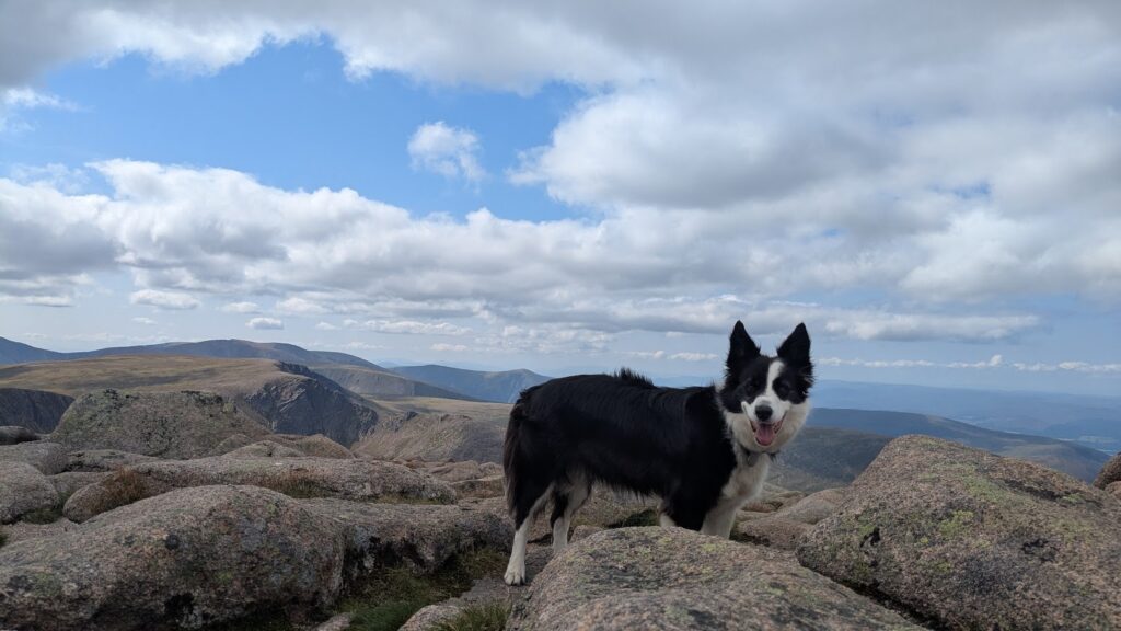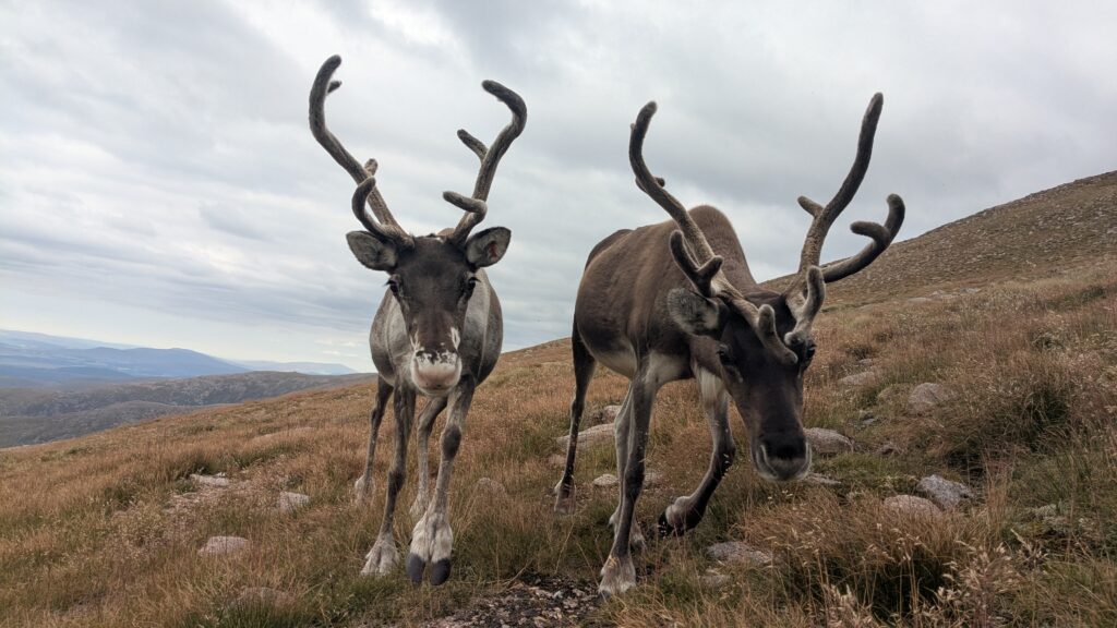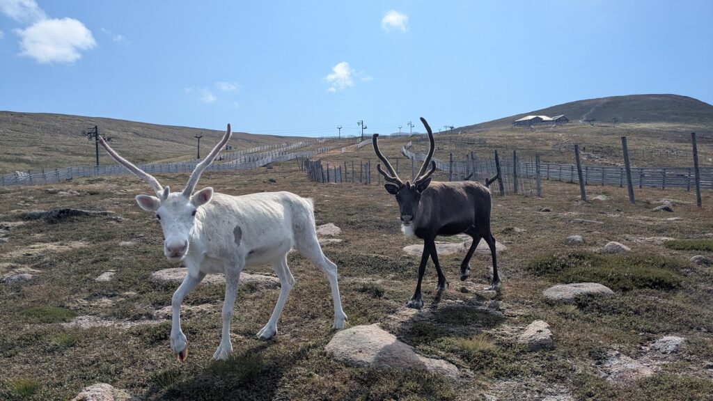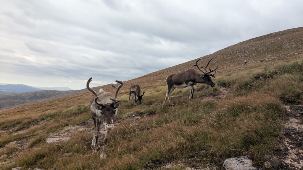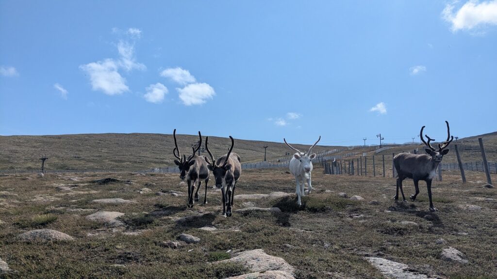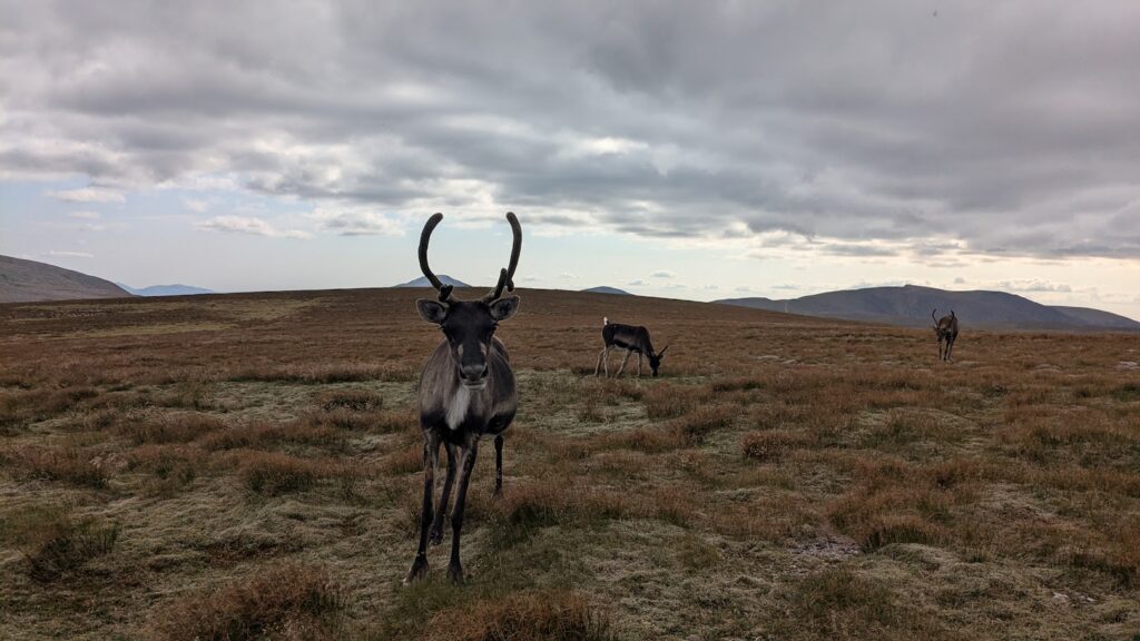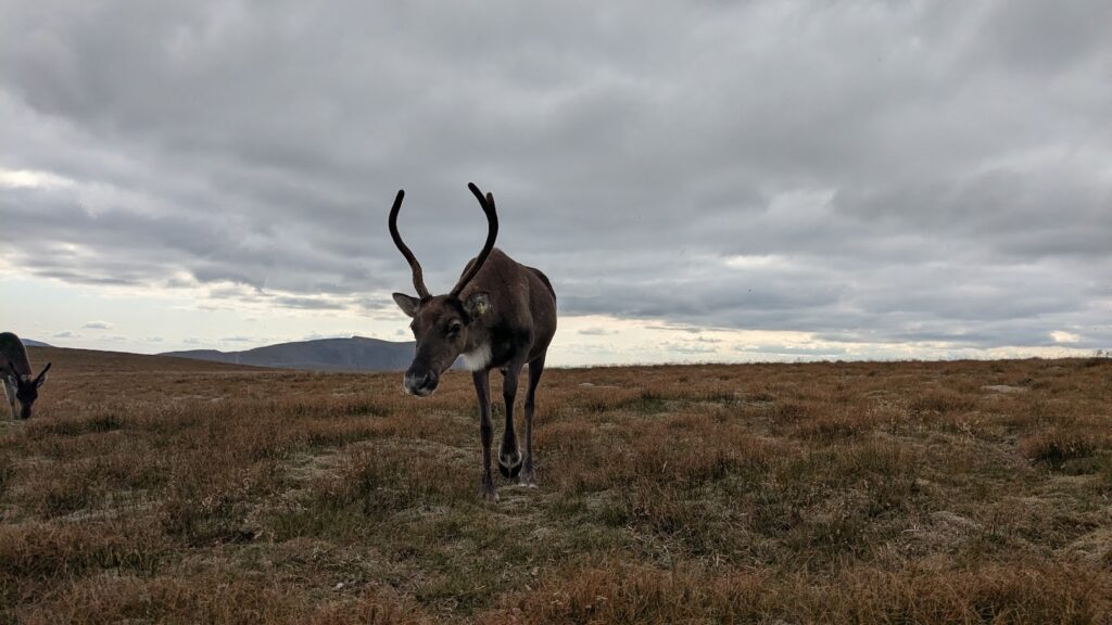 I was off for a walk with a friend around Cairn Gorm. During our walk we saw three groups of free-rangers, in different places on the hill which was really wonderful. The first group consisted of Orinoco, Nuii, Vanilla and Solero. The second group was Helsinki, her calf River and Brew. The final group was Sundae, her calf Salsa and Mississippi. My friend Hannah was visiting for the weekend and she had come on a Hill Trip to see the reindeer the day before so it was a real treat for her to see some of the girls out free-ranging. We also had my friend’s dog with us, Foss, so we had to take it in turns going over to see the reindeer whilst one of us waited with Foss at a good distance. We all had a wonderful walk and seeing the groups of free-range reindeer certainly made my day.