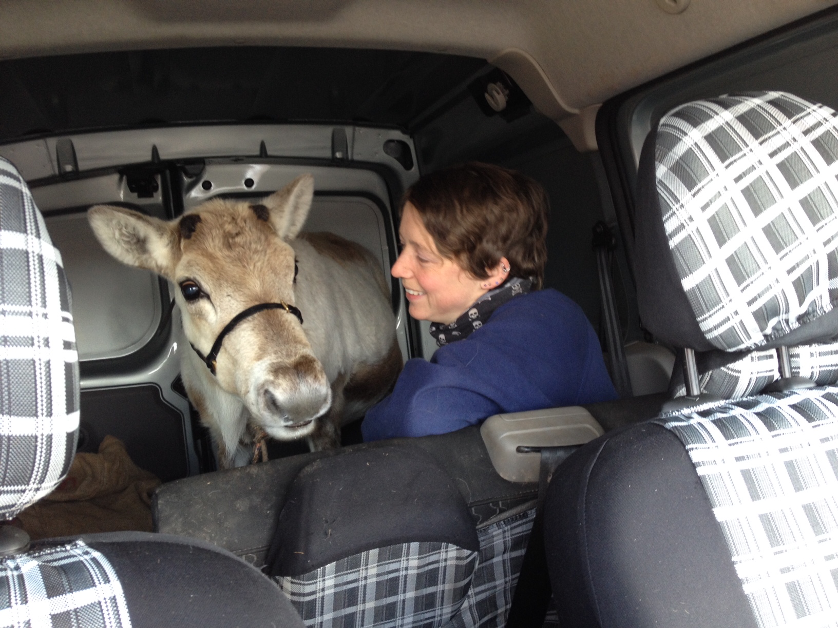 Reindeer never fail to amaze me with their no nonsense approach to life and quick assessment of whether unusual situations are anything to worry about. At the grand age of nearly 13, Esme has definitely sussed out that us humans are trustworthy, and as long as a bag of feed and a reassuring voice is on offer, she has no problem following us into slightly unorthodox situations!
