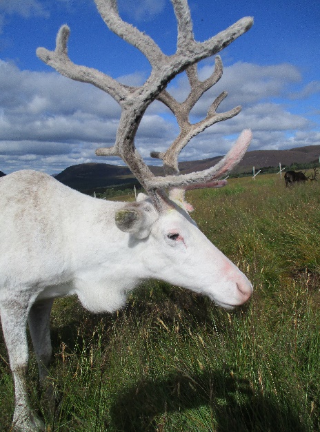 One of the herd here is leucistic – a white coloured reindeer named Blue (born in a cheese-themed naming year). Blue is also deaf, so doesn’t hear the clicking. One day I saw Blue wandering off alone, and wondered how the herd relates to him, a herd member who doesn’t respond to the kind of reindeer body language and communication that is shared by the clicking. Like, if there’s the need to run, Blue may not hear how the clicking speeds up around him. It’s not a problem here – there’s no danger to run from, and the herd live out their lives to the full and any unusual behaviour is noticed straight away.