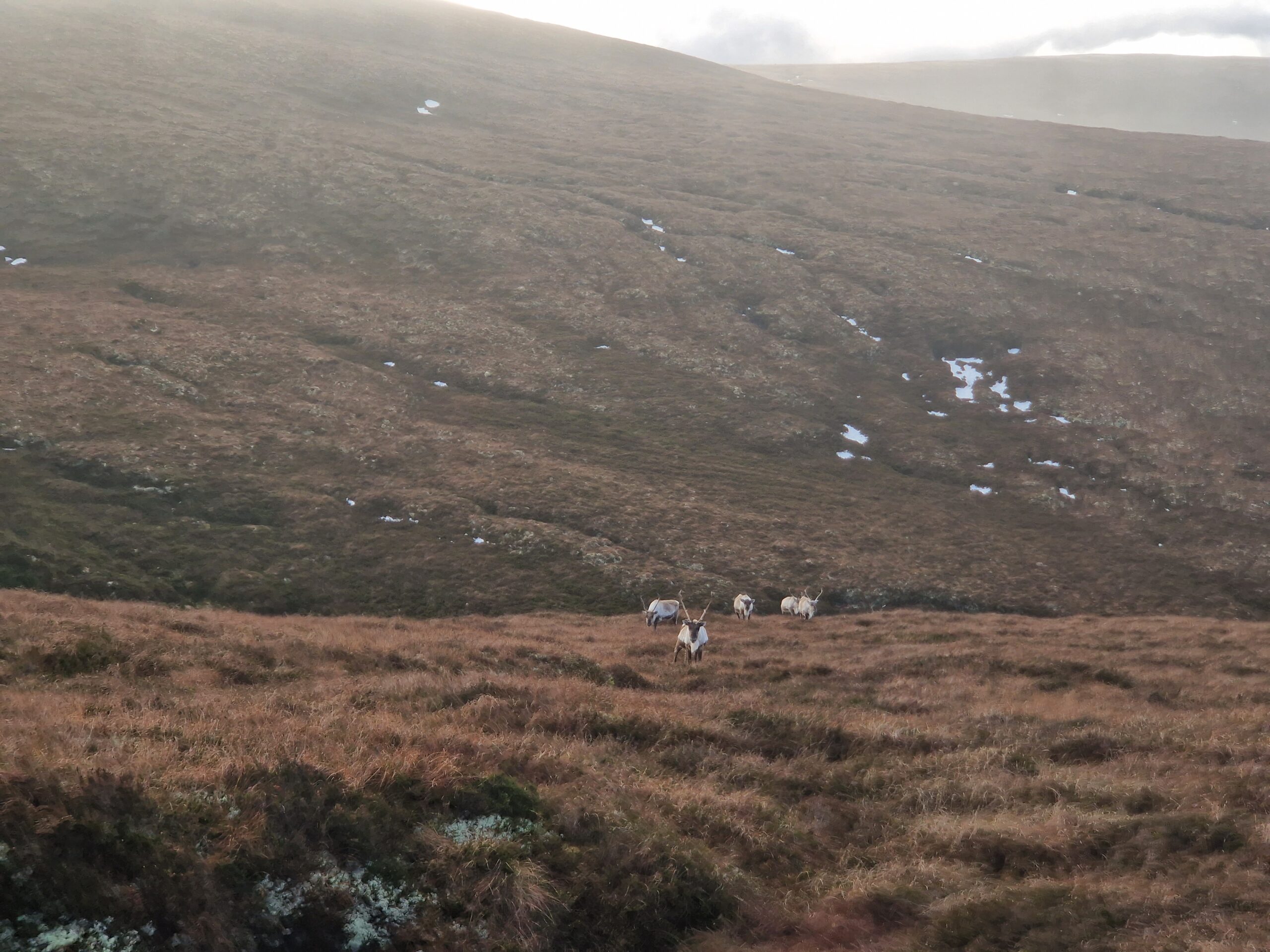 A lot of our work focuses on our herd here on Cairngorm, but a lot of you will know that we have a secondary site, and it is always lovely to get out that way to help Tilly! Recently Sheena and I went on a free-range mission to move a group of reindeer that were just out of our boundary line. The group of reindeer we were moving included some older girls and three young bulls, I have compiled some pictures of the outing for the reindeer’s wonderful adopters. The group were initially grazing in two separate groups but once we had called them, the reindeer joined up and made their way up hill towards us.