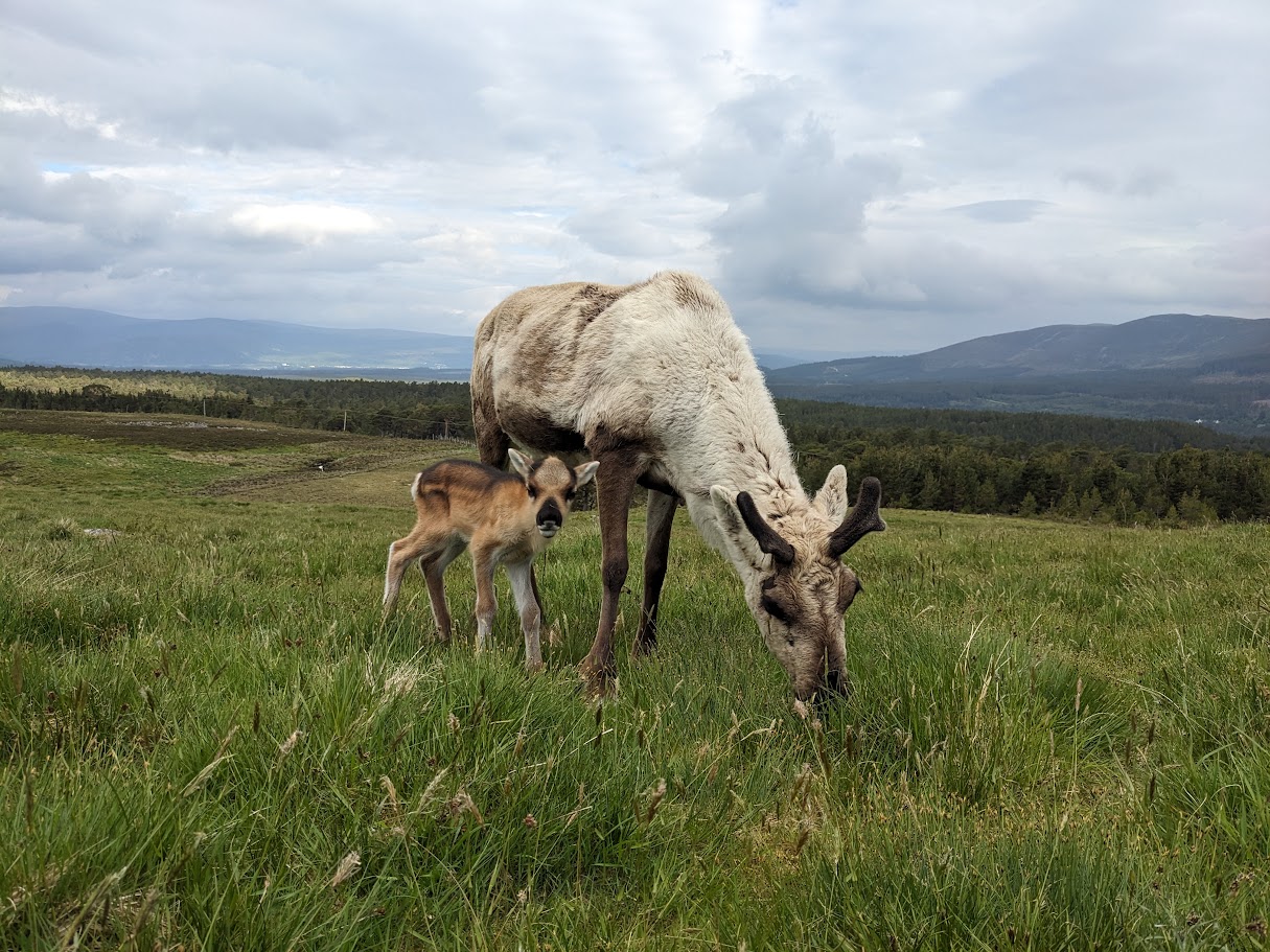 Florence and her new born boy! He was born on the 22nd of May 2024, this was taken a few days later on the 26th.Florence’s calf also on the 26th of May – just look at those “eyebrows”! 10th of June – Cuppa next to his mum a few weeks later and already bigger and bolder. He headed out to free range for the summer the next day.19th of June: I was lucky enough to bump into Florence and Cuppa whilst they were out roaming freely in the hills. They looked so happy up in lovely herd of other cows and calves.This is from the same day as above but just makes me smile – Florence coming over to say hello and Cuppa behind with those distinctive brows!The next picture I have of Cuppa is this one from September the 15th so a jump of 3 months. It’s actually Andi’s photo after Cameron successfully caught him and put him on a halter so they could be walked back into the hill enclosure. What a size difference compared to June! He’s now in his smart summer coat and has grown antlers. Mum Florence is on the left, Lolly is on the right.This is Florence and Cuppa in the hill enclosure on the 3rd of October. Compared to the other calves, Cuppa is one of the smallest of 2024. We believe he had a illness in late summer/early autumn, just before coming back into the hill enclosure from the free range. As you can see he’s cast his antlers already – often a sign of illness. Thankfully with some extra food and Florence by his side he’s rallied around and has grown in to a cheeky confident wee reindeer as you’ll see…13th of December – Cuppa and Florence looking great! Compared to the last photo you can see his winter coat has really grown through… and Florence has broken an antler. 15th of January – After Cuppa attended a couple of Christmas events and with the Christmas holidays over, the pair are now now back out free ranging in the hills and doing really well, he’s never too far from Florence.13th of February – Cuppa and Florence in the sunshine. He’s growing in confidence and cheekiness by the day!26th of February – The pair up high on a ridge before being moved down for the daily Hill Trip. Cuppa clearly wanted a lie-in this morning. 12th of March – Winter is back! Cuppa and Florence on the 7th of April 2025. The pair are often still together but as you’ll see from the photos rather than being rather shy and sticking behind Florence, Cuppa is now much bolder and comes extremely close on the hunt for food.Cuppa on the 25th of April. Cuppa has remained close to Florence’s side for the last 11 months but now he’s almost a year old, they have been separated. Cuppa has joined up with a big herd of male, at our second site in Glenlivet. He’s doing really well and as you can see is beginning to grow another set of antlers. Meanwhile…… Florence is doing well and is having a well-deserved year off from motherhood, which means she’ll be able to spend the vast majority of it free ranging in the hills. Here’s Florence (and her mum Spy behind) on the 29th of April enjoying herself on the free range and beginning to grow a lovely set of new antlers.Cuppa on the 18th of May – a few days before his 1st birthday!