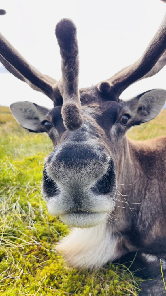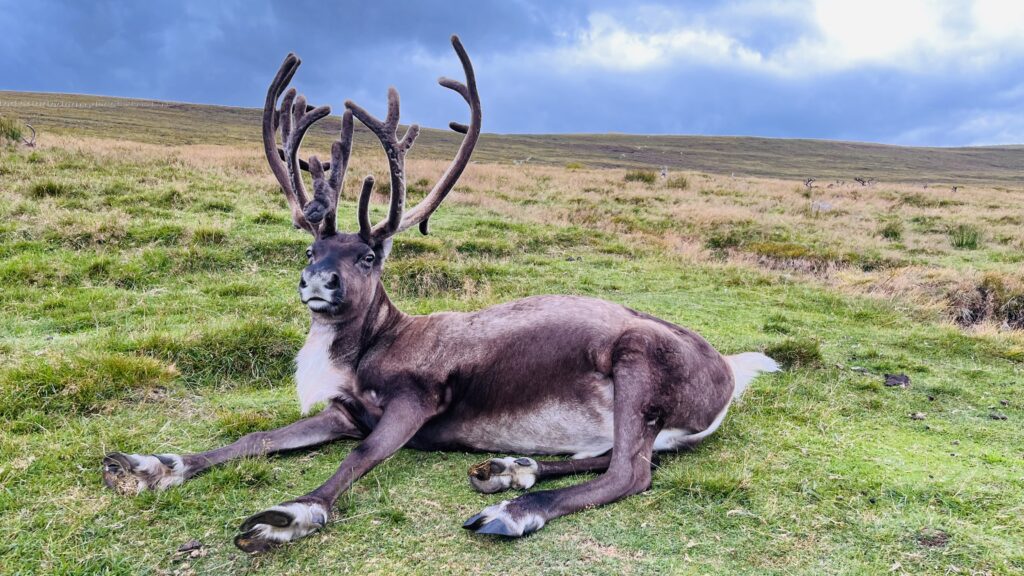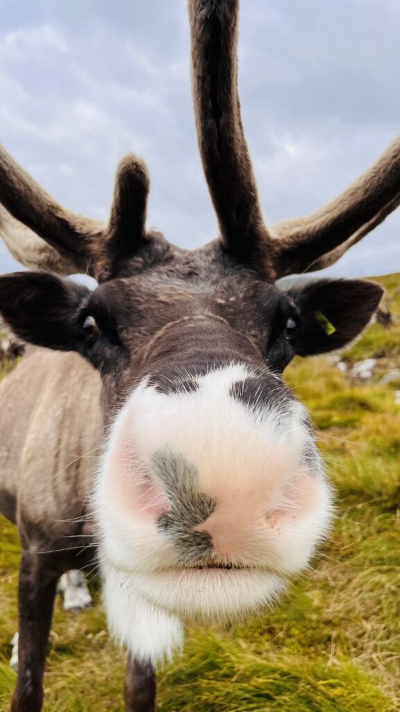 Now let’s talk about antlers! From little twigs on top of a calf, to magnificent displays fit for a castle fireplace once a bull has finished with them – antlers can be a great way to tell reindeer apart. After the age of three or four, when a reindeer is fully grown, you can usually count on a reindeer to grow the same set of antlers every year. The shape and size of a reindeer’s antlers is genetically inherited by their parents, and is unique to that reindeer, just like our thumb print (how cool is that?!). there are some factors that can influence this, such as the health of the reindeer, their age, if a male has been castrated or a female is caring for a calf. But generally, you can count on antlers being a very reliable way to identify a reindeer. Until they shed them of course!