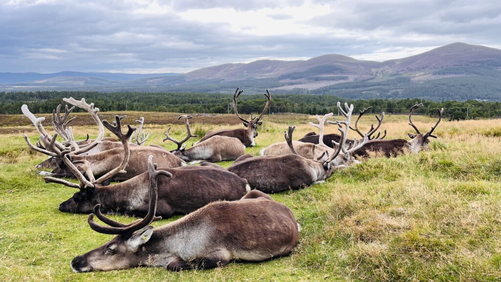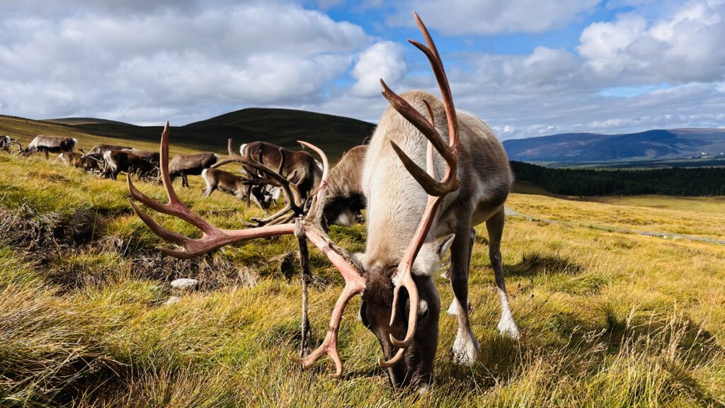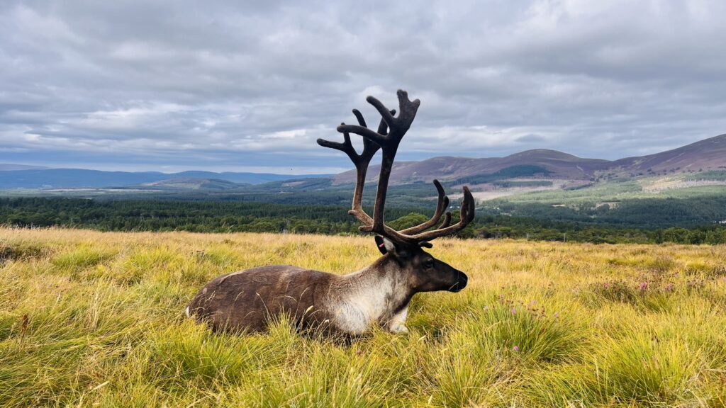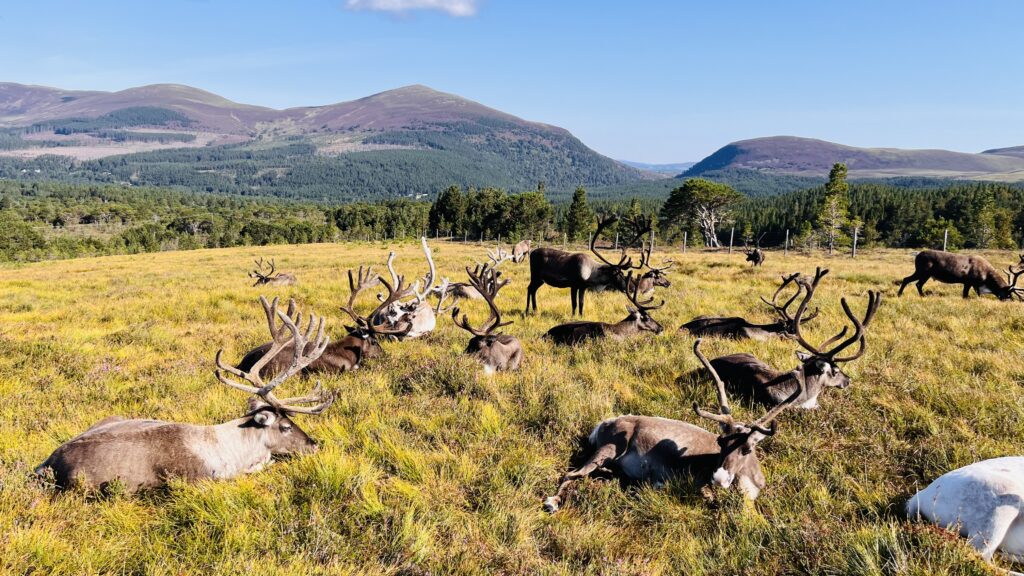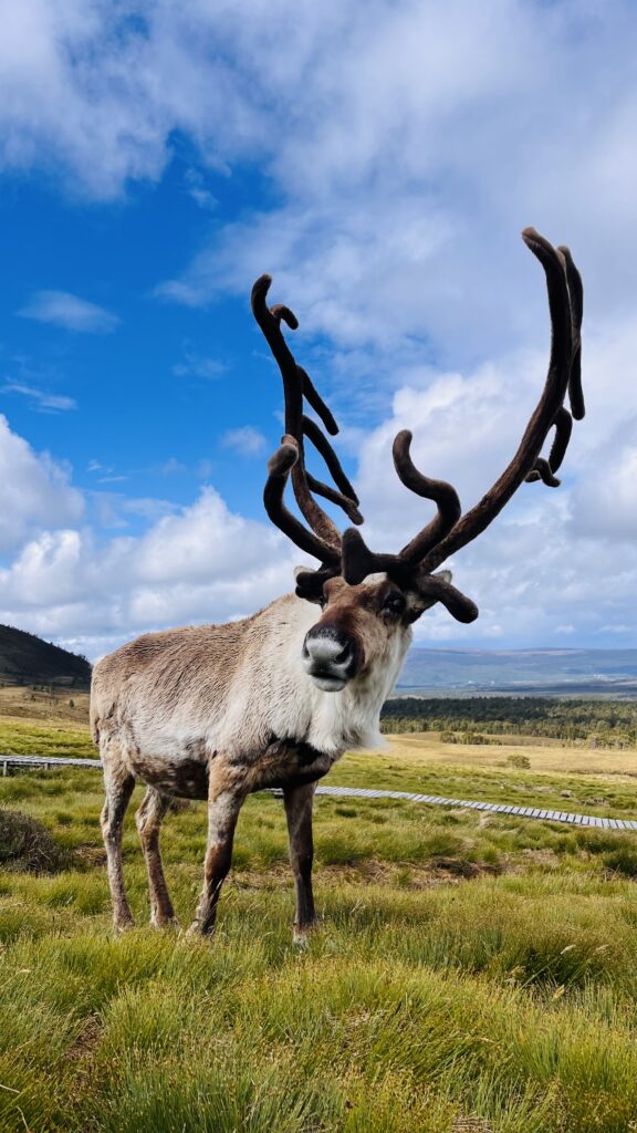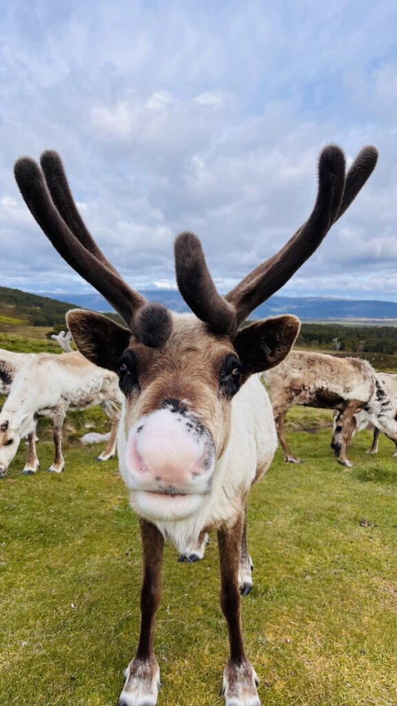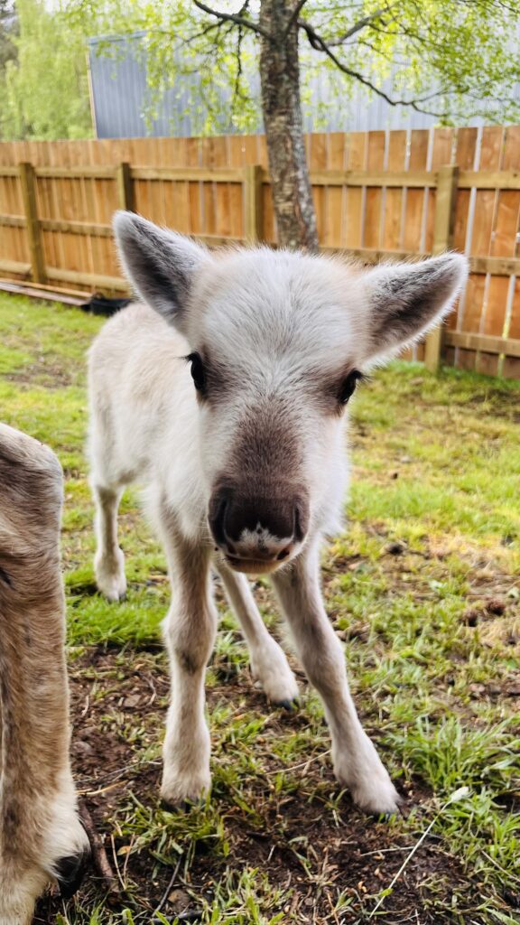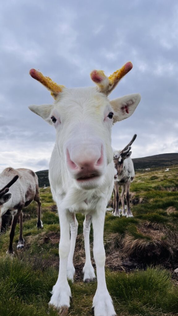 I’ll start with the easiest way to tell the reindeer apart – their ear tags. Each of our reindeer are tagged with a group colour and a unique number. The colour changes each year, allowing us to quickly work out how old they are. For example, yellow ear tags are for this year’s yearlings, born in 2024 and all named after hot drinks. Silver ear tags belong to the peas, beans and seeds calves of 2020, making them all five this year, and so on. The number then allows you to straight away know exactly who the reindeer is (orange tag 201 for instance, being the lovely, and very well-known Sherlock). The downside to this method is, you have to memorise over 150 ear tag colours and corresponding numbers…