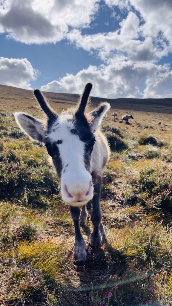 The more enjoyable method is personalities. All our wonderful reindeers have their own unique quirks and traits. Whether they’re extremely greedy and can always be counted on to be front and centre for our hill trips (I’m talking about you Nile!), or if they have a more reserved character and tend to be the shy contemplator at the end of the feed line. Their personalities shine through and can be a good way for us to tell who’s nearby.