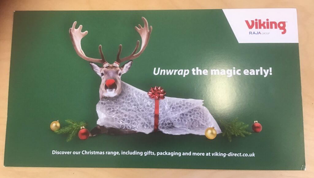 Eventually, having stared for too long at the vaguely fallow deer-esque antlers, still in velvet, on a head that isn’t a fallow, I realised it’s an AI picture entirely (as opposed to some bubble wrap and a ribbon being photoshopped onto an actual photo). God help us. So I’m naming and shaming you, Viking Office Supplies!