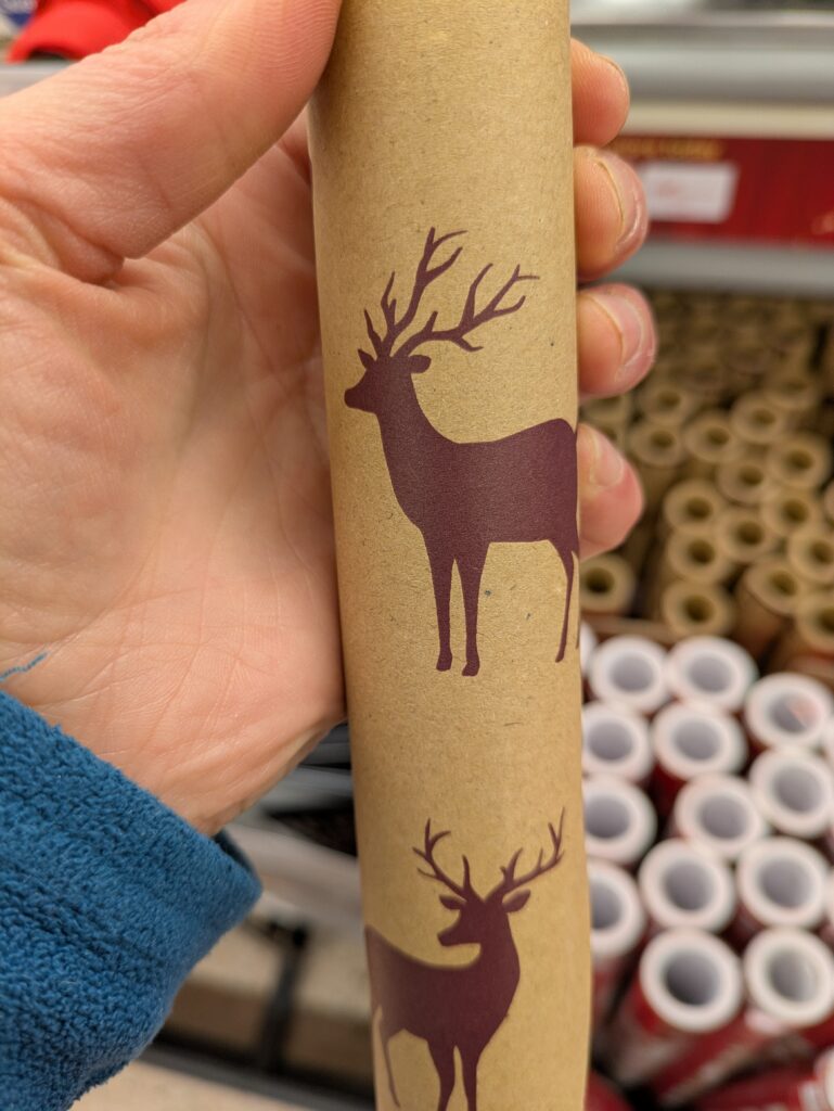 Ah, wrapping paper. Also a common offender. I’m not even sure what this (below) is supposed to be. It ain’t no reindeer, that’s for sure…