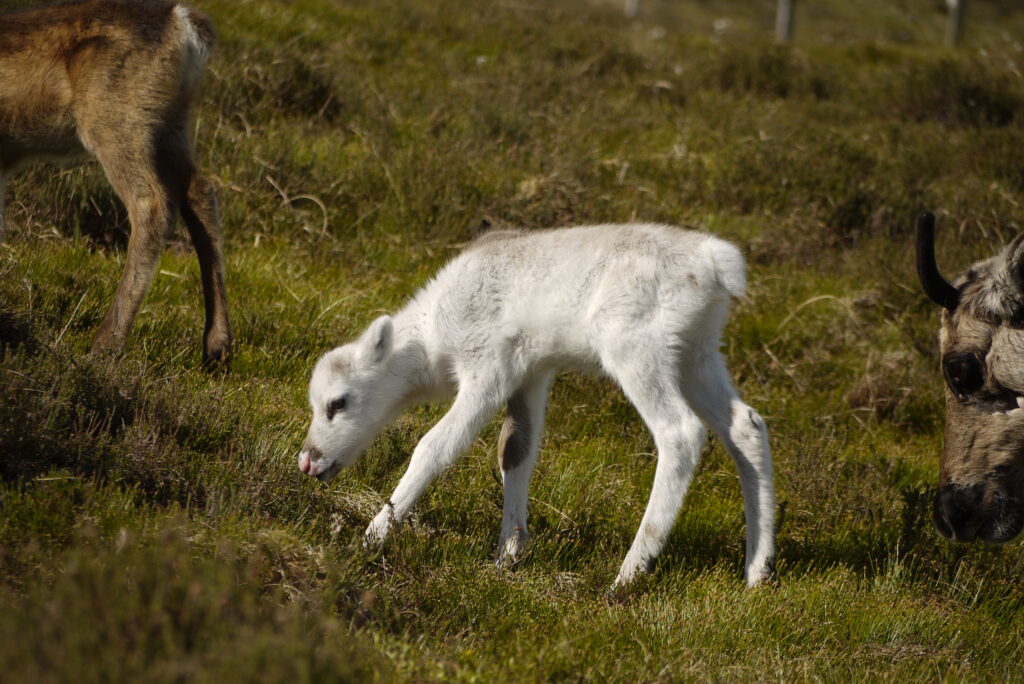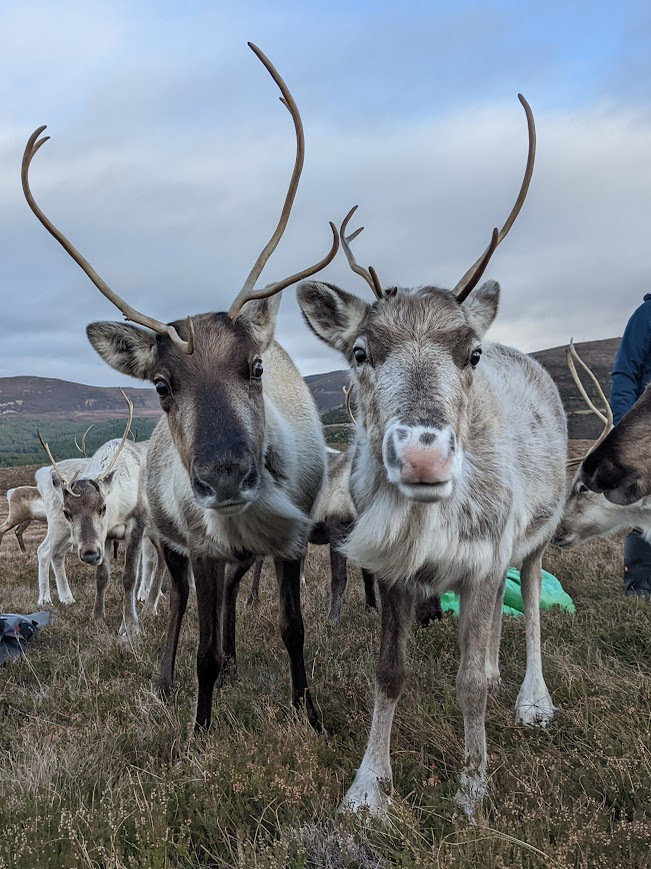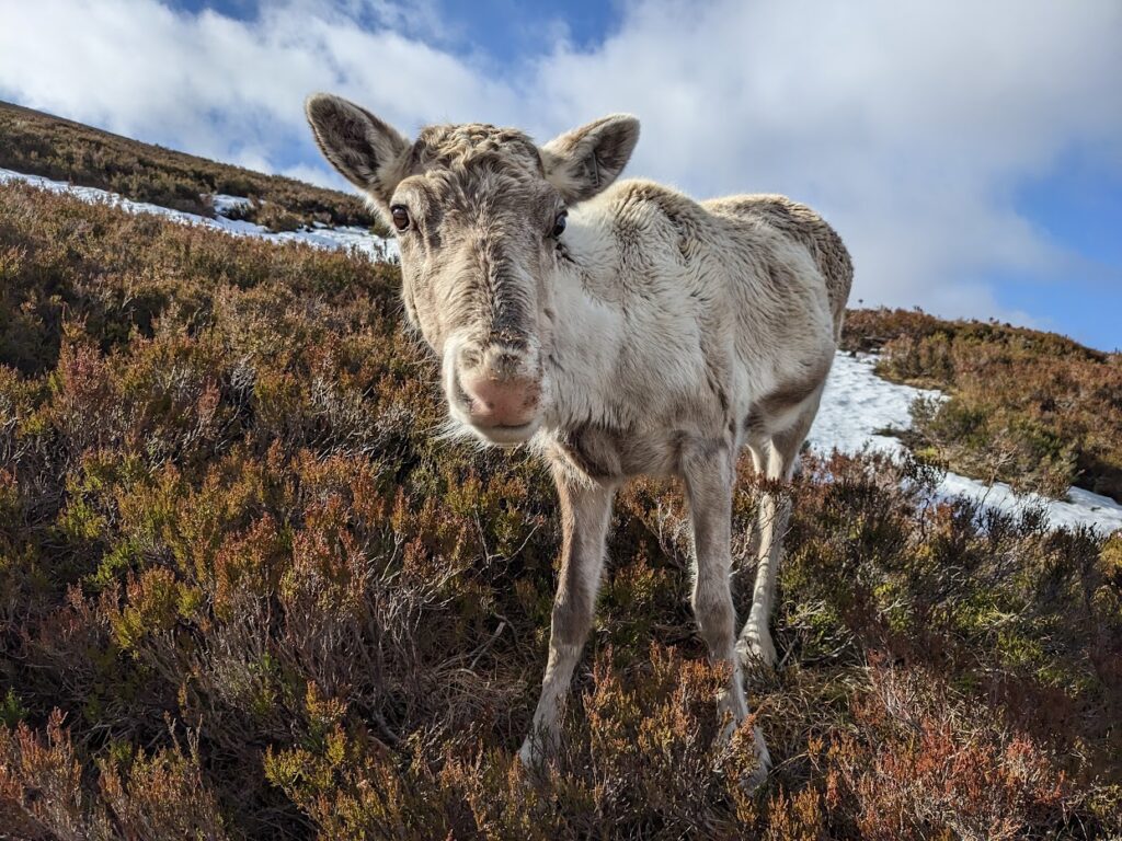 Just over a week passed and there were no more reports of her. As normal at that time of year, we drive up to Cairngorm Base Station and spy the hills to see if we can see any free ranging reindeer. On the 9th of October, Sheena and I were up on the hill early looking for reindeer and who did we bump into? Chickpea! Hooray! Along with another yearling female called Sunflower. Her new winter coat looked a bit tatty, and we think she must’ve had an illness in the late summer, but otherwise she appeared just fine.