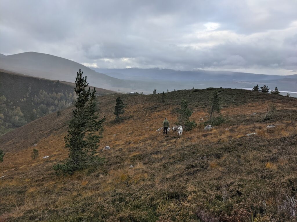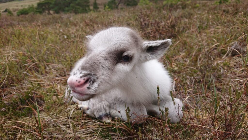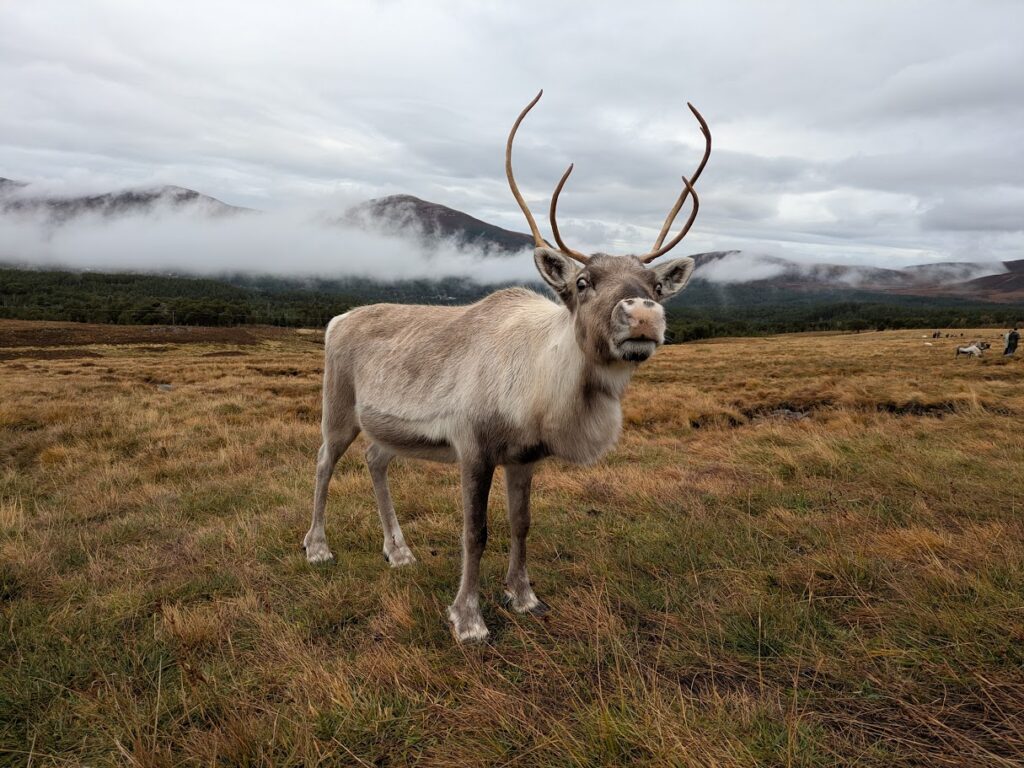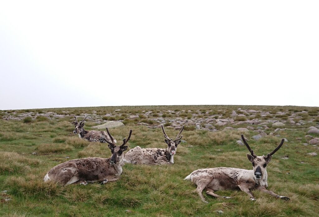 At the end of the summer/early autumn we start seeing the free ranging reindeer more on lower slopes of the hills as the higher plateau gets colder, the grazing deteriorates, and the tasty mushrooms start appearing at lower altitudes. By around mid-September 2021 we’d managed to catch up with all of the free rangers, except for one, Chickpea! What had happened to her? This occasionally does happen, a reindeer goes missing and after a while we have to very sadly conclude that they must’ve died whilst out free ranging, perhaps succumbing to an illness. But we didn’t give up hope for Chickpea! On the 29th of September a hillwalker reported a small single reindeer on the mountain plateau. With all other reindeer accounted for this had to be Chickpea. The rest of the free ranging herd were in a good area not too far away from the hill enclosure, so we just had to hope Chickpea was able to navigate her way to them.
