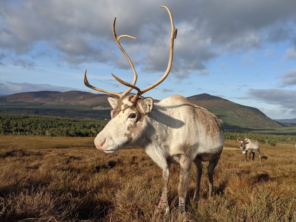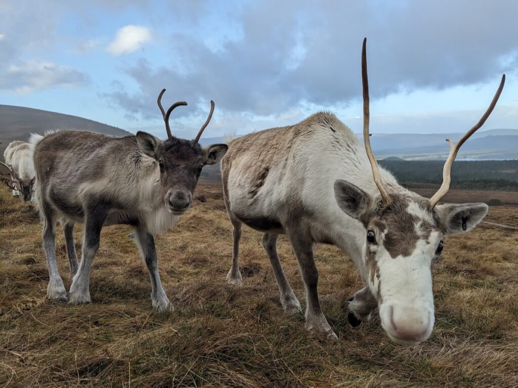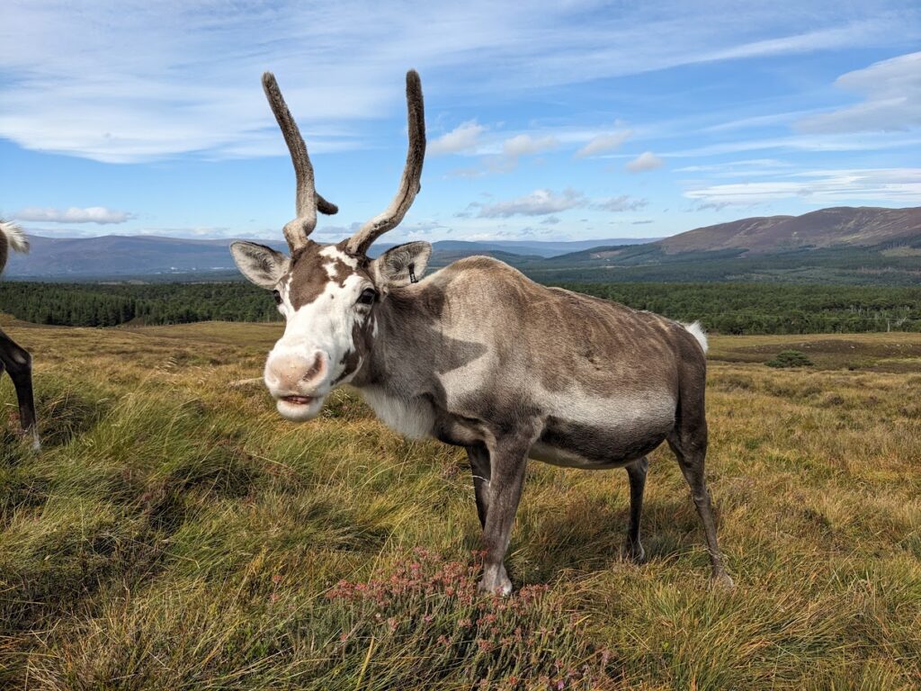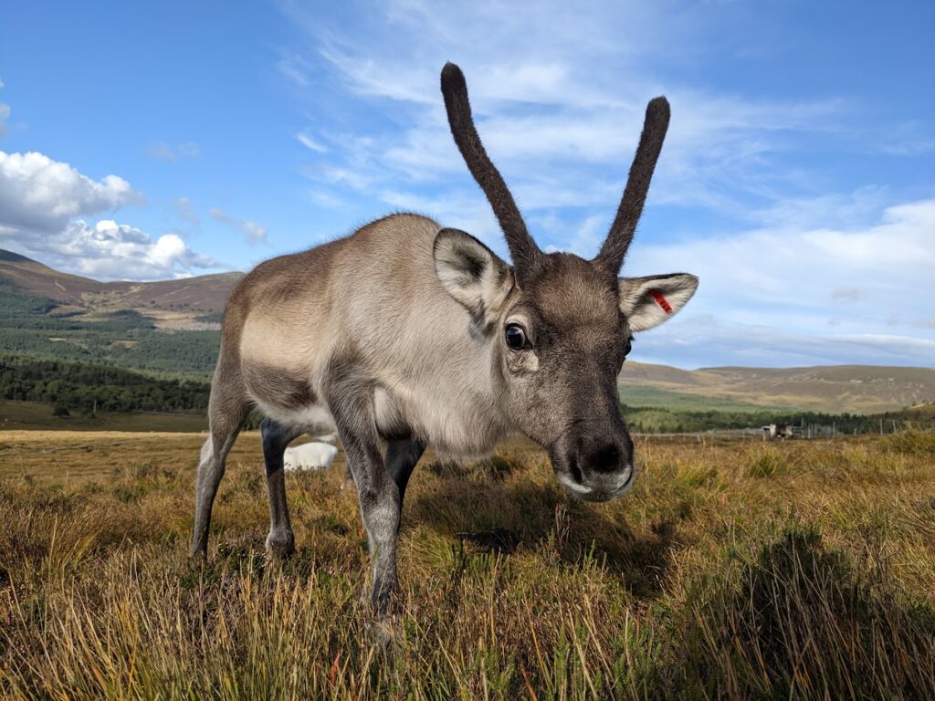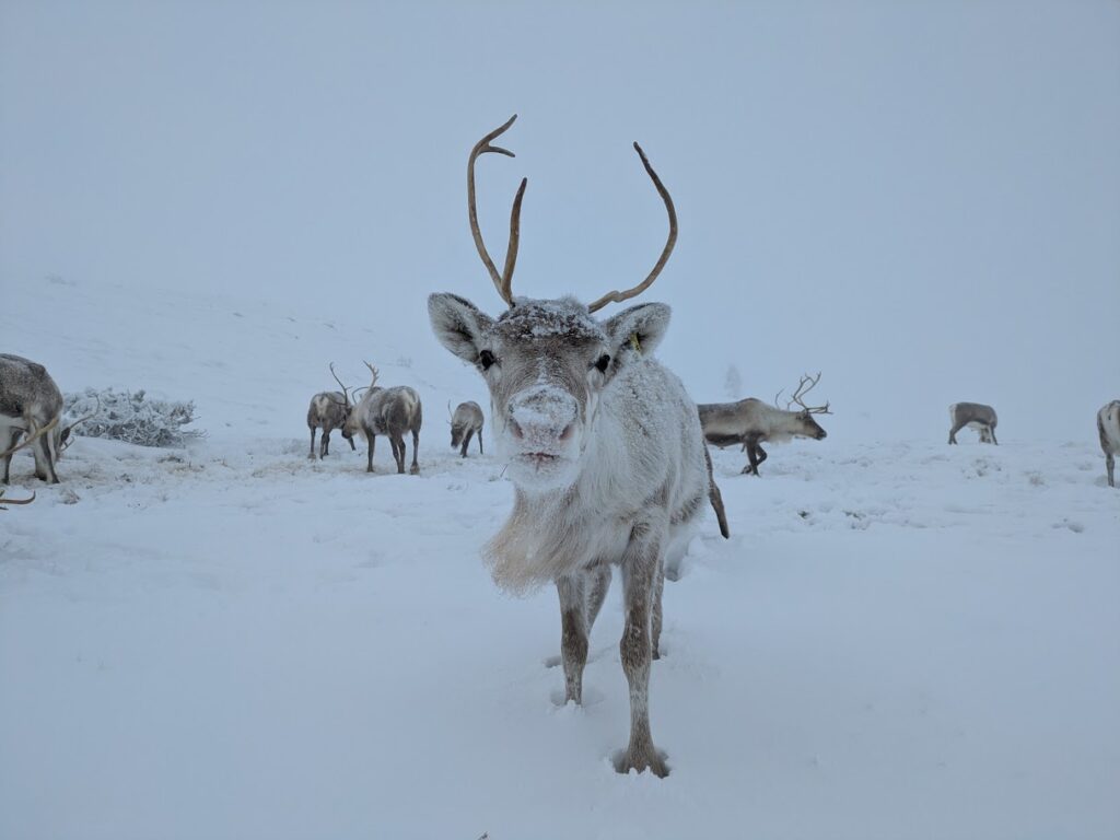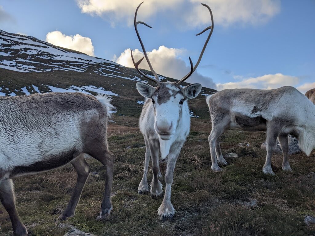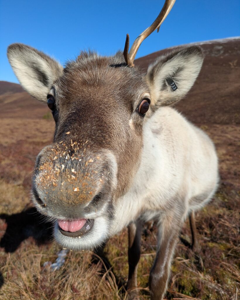 She has a very distinctive white patchy face and often reindeer with white noses or faces stand out from the herd and get lots of attention. But in general I would say Cheer has avoided the spot-light for most of her life as naturally she is quite shy around people, preferring to keep her distance, and she’s not super dominant towards other reindeer either. On Hill Trips she’ll often be more in the distance and definitely not muscling her way in for the hand feed amongst the greediest of reindeer.