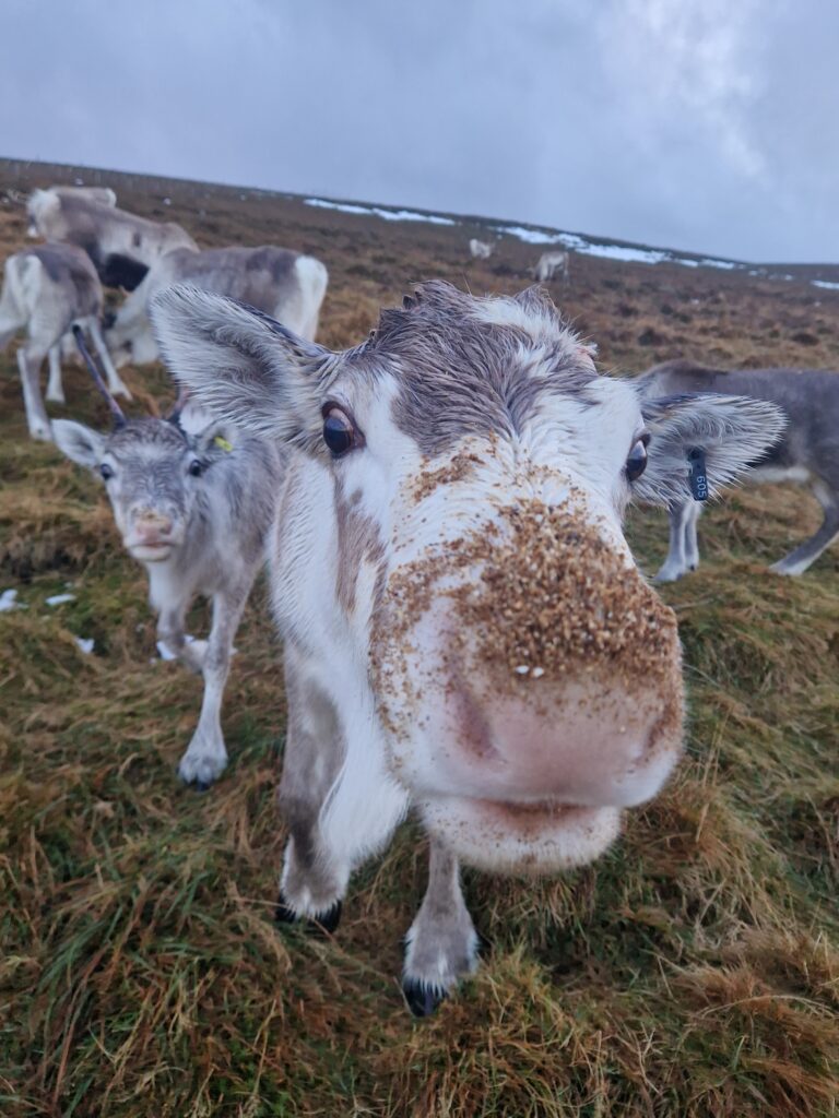 I don’t really remember encountering Cheer when I first came to be a herder for around 10 months in 2017 – 2018 (sorry, Cheer!). However, when I returned to reindeer herding in 2021 I got to know her much better. She had a calf in 2022 (Choc-ice), 2023 (Shannon) and 2024 (Chai) which meant Cheer spent a bit more time in our hill enclosure (as opposed to free ranging out in the mountains) during the calving season in the spring and again in the autumn so she was around more.