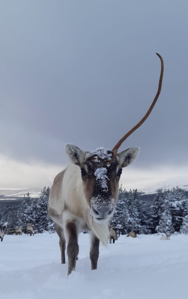 The reindeer look magnificent in the snow when it all just sits on their nose, and of course it doesn’t melt because they are so well insulated that they don’t let the heat out to melt the snow. However, all the humans do not look magnificent and are bumbling around in the snow trying not to fall in a snow-covered burn. Unfortunately, yes, three of us did fall in the same burn at the same time.