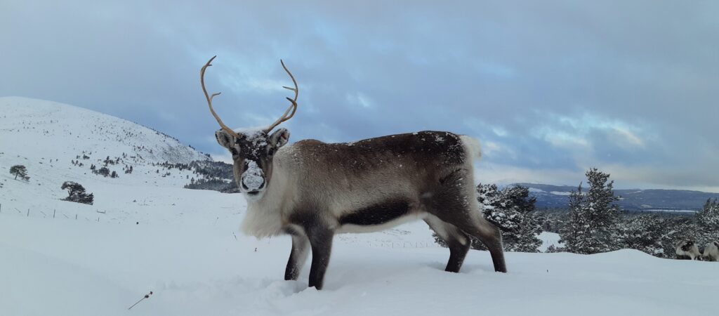 When we got to the enclosure, we had all the reindeer on Cairngorm waiting for us. The girls who were on the free-range were asking for a wee bit of extra food too. We picked up the food for the reindeer in the enclosure and headed up the hill. It was a frosty morning and cold, but it was so beautiful. The sun even came out for a while which was lovely. We were all wrapped up but of course the reindeer were very well insulated with their winter coats. We usually feed the reindeer in the hill enclosure a couple of times a day depending on what time of the year but since we were only feeding them once we had a lot of food to take. Thankfully the team on Christmas Eve took it all up to the bins on the hill so we didn’t have to carry it all the way up.