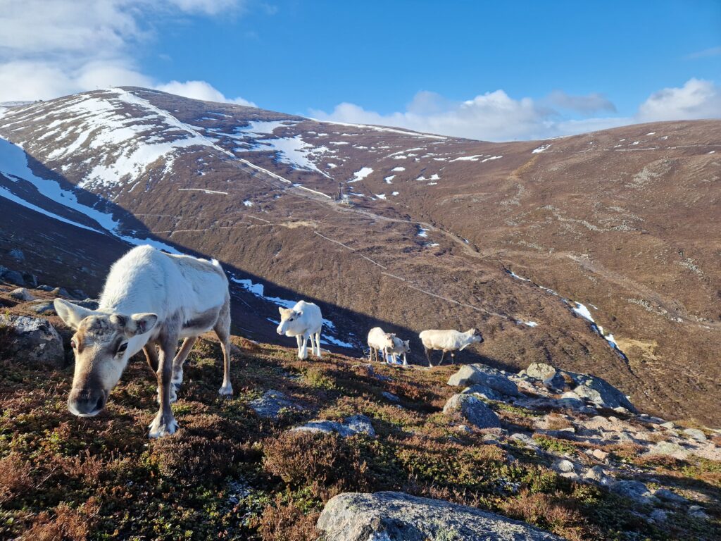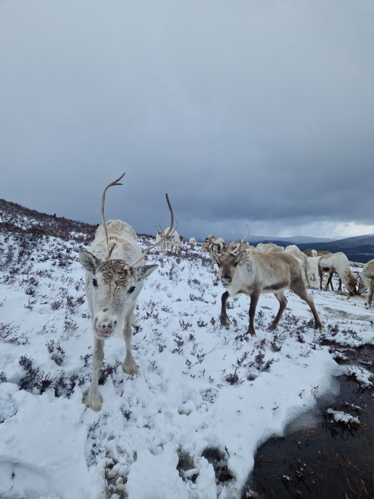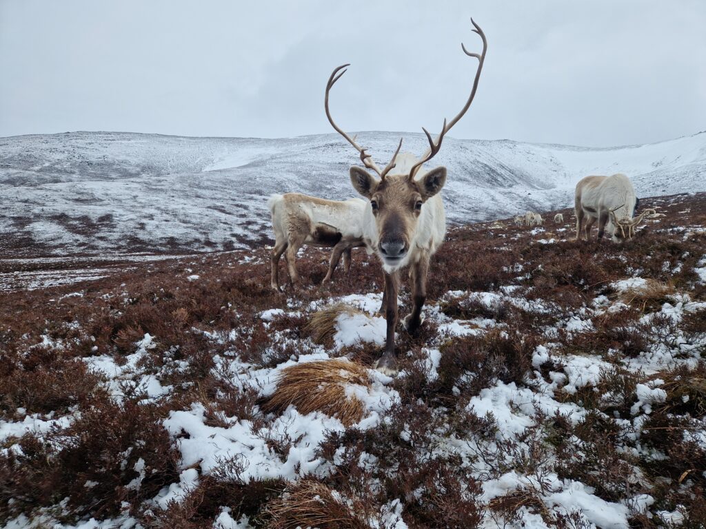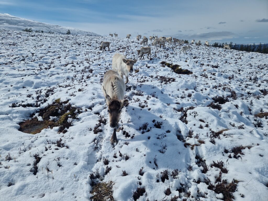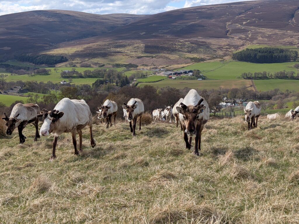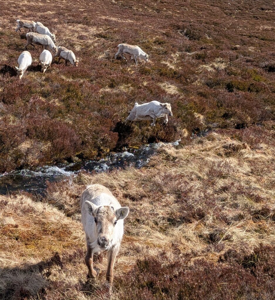 1st of April: After taking visitors out to see the reindeer in the morning, when there was no snow, this was an absolute treat to find them again in the afternoon! You can see Disco on the left, Sundae behind her, Turtle on the right and Tetley.2nd of April: Disco has lost one of her antlers over night. Here is Disco and Latte leading the herd over the the Hill Trip spot. 3rd of April: A trip to see the reindeer over on our Hill farm. From left to right we have Caterpillar, Mangetout, Merida, Spartan, Hemp, Oatcake, Spy, Pumpkin, Brie, Mushy and Busby 4th of April: Beautiful Amazon looking for extra food after the Hill Trip. Over the last year Amazon has grown in confidence and is very greedy.5th of April: As you can seen the snow hung around lower down for a few days. Here is Chai and Camomile scouting out whether i’ll offer more food.7th of April: A suprise visit from Ruth and Baby M9th of April: Despite Cheer having an epic set of antlers, this didn’t deter Trilby from a bit of antler sparring. At the time, Trilby only had half of one antler left. They will both soon lose these antlers in preperation for a new set to grow.10th of April: Hopscotch and Foxtrot leading the herd over a steep sided ridge, the herd didn’t bat an eyelid, and it often amazes me the places the herd chooses to rest. 15th of April: Ryvita, Sika, Christie and Winnie in the Mid ground. Ryvita has the start of her new antlers growing. I often find at this stage the reindeer often look a little like Giraffe. 16th of April: Tetley with Latte excelling at jumping the burn in the background. Turns out reindeer can be agile!18th of April: Our cows and calves are now in our hill enclosure before we split our pregnant females, who will stay in the hill enclosure for the calving season which will start in May. Here is lovely Shannon enjoying some feed after the Hill Trip.19th of April: Before coming over to our hill enclosure, Brie spent her time free ranging at our secondary site. 21st of April: Here come the boys! Dr Seuss (on the left) and Cowboy (on the right) leading the boys up for their feed.