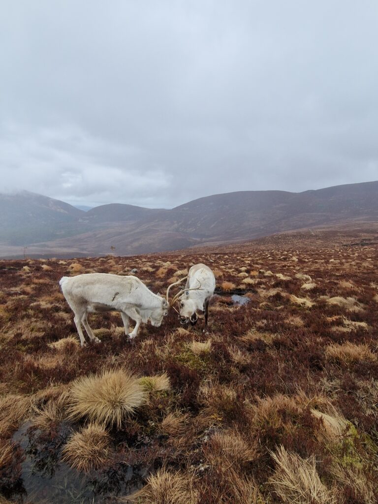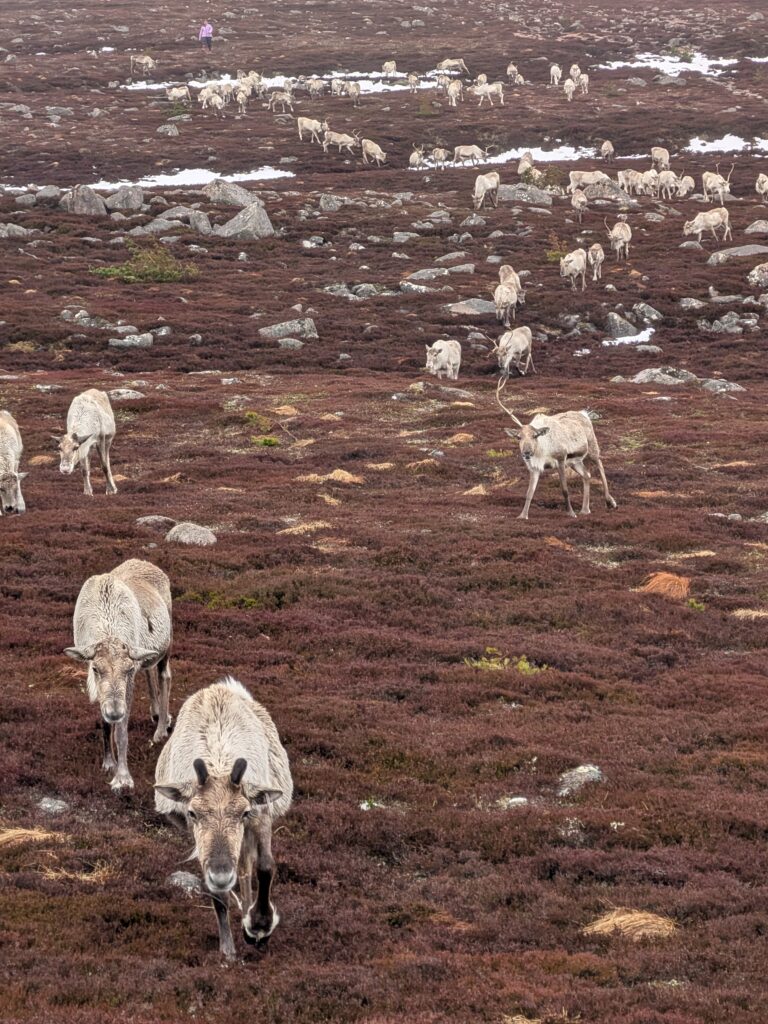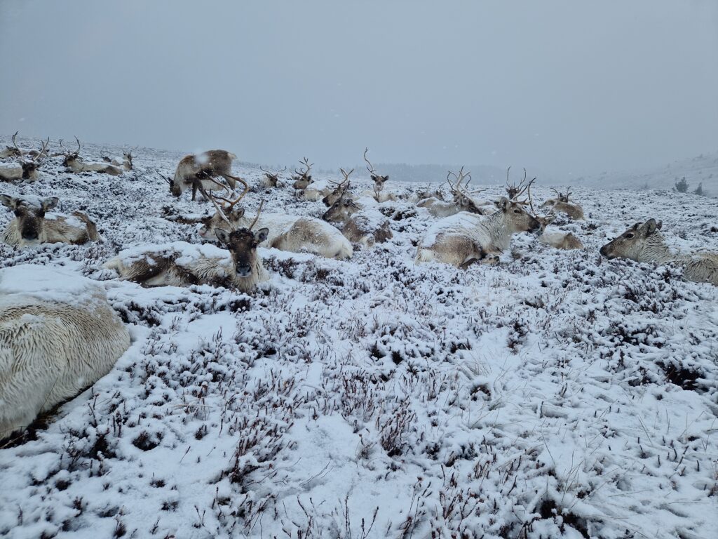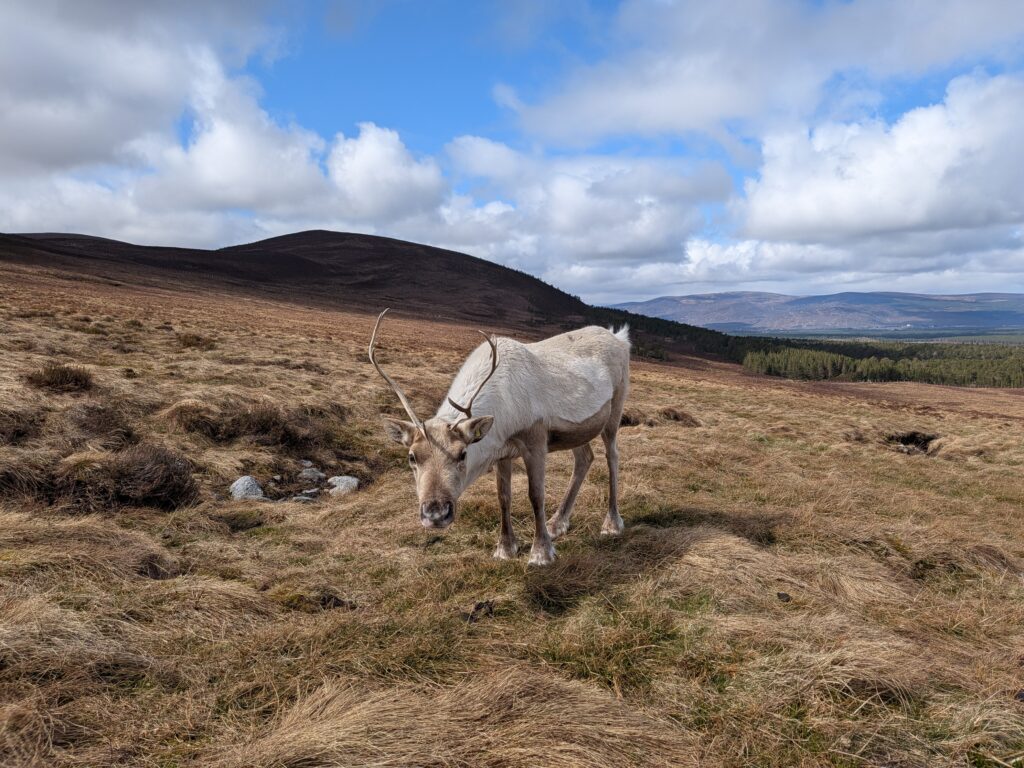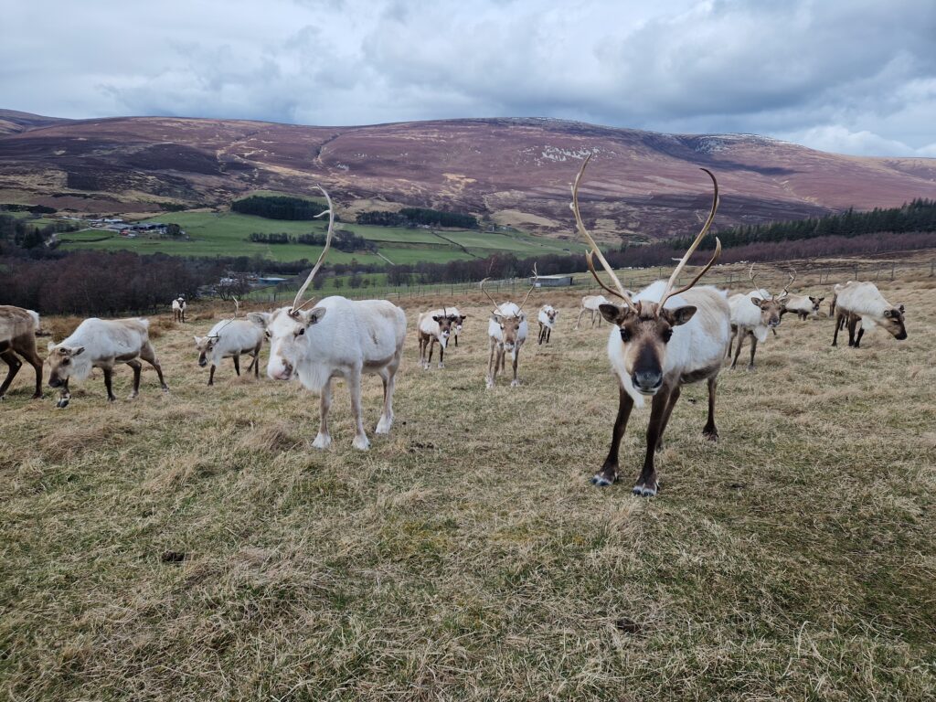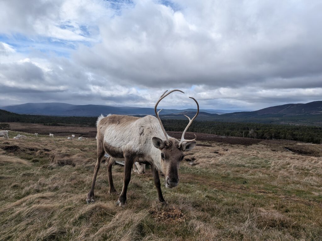 1st of April: After taking visitors out to see the reindeer in the morning, when there was no snow, this was an absolute treat to find them again in the afternoon! You can see Disco on the left, Sundae behind her, Turtle on the right and Tetley.2nd of April: Disco has lost one of her antlers over night. Here is Disco and Latte leading the herd over the the Hill Trip spot. 3rd of April: A trip to see the reindeer over on our Hill farm. From left to right we have Caterpillar, Mangetout, Merida, Spartan, Hemp, Oatcake, Spy, Pumpkin, Brie, Mushy and Busby 4th of April: Beautiful Amazon looking for extra food after the Hill Trip. Over the last year Amazon has grown in confidence and is very greedy.5th of April: As you can seen the snow hung around lower down for a few days. Here is Chai and Camomile scouting out whether i’ll offer more food.7th of April: A suprise visit from Ruth and Baby M9th of April: Despite Cheer having an epic set of antlers, this didn’t deter Trilby from a bit of antler sparring. At the time, Trilby only had half of one antler left. They will both soon lose these antlers in preperation for a new set to grow.10th of April: Hopscotch and Foxtrot leading the herd over a steep sided ridge, the herd didn’t bat an eyelid, and it often amazes me the places the herd chooses to rest. 15th of April: Ryvita, Sika, Christie and Winnie in the Mid ground. Ryvita has the start of her new antlers growing. I often find at this stage the reindeer often look a little like Giraffe. 16th of April: Tetley with Latte excelling at jumping the burn in the background. Turns out reindeer can be agile!18th of April: Our cows and calves are now in our hill enclosure before we split our pregnant females, who will stay in the hill enclosure for the calving season which will start in May. Here is lovely Shannon enjoying some feed after the Hill Trip.19th of April: Before coming over to our hill enclosure, Brie spent her time free ranging at our secondary site. 21st of April: Here come the boys! Dr Seuss (on the left) and Cowboy (on the right) leading the boys up for their feed.