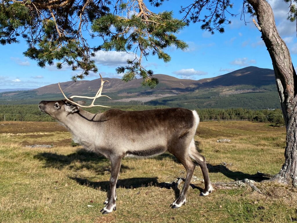 I did manage to get a couple of photos through the antlers with a reindeer herder in the background which was a treatand I was very lucky one lovely day when I spotted the most amazing reindeer under the big photogenic tree with Meall a’ Bhuachaille (the hill) behind it and I took a few different pics while it was reaching up to the branches of the tree as if it was a giraffe on the African plains feeding from the high up leaves and then the same reindeer around the base of the tree with beautiful sunlight on it.